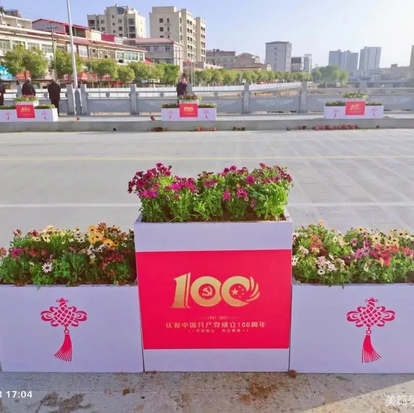 昌盛桥两面共计摆放32组立体式组合花箱,每组花箱长达2.1米,摆放间距4.2米。箱体外侧以“庆祝中国共产党成立100周年”为主题进行设计,为建党100周年营造热烈喜庆氛围。