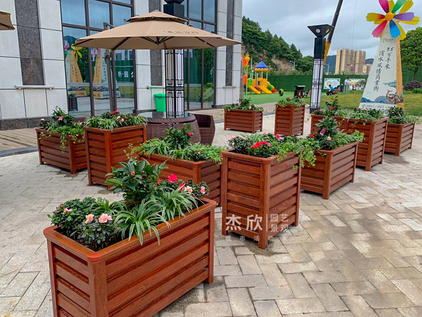 铝合金花箱在外观上,接近防腐木花箱,能够呈现出自然的木纹效果,比如红木色、黄檀木色。但也不局限于此,也有白色的铝合金花箱。