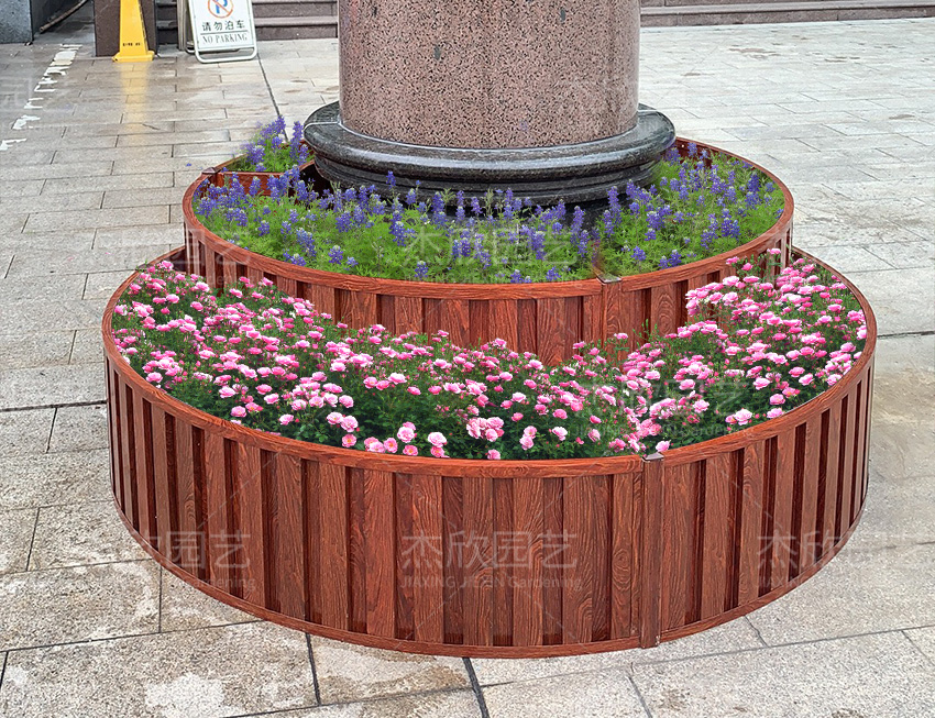 接下来是一个树围花箱 ,大家对树围花箱还是挺熟悉的吧。大多数的树围花箱,是没有底板的,就在树木的四周围一圈,便利实用。这款树围花箱是两层组合,又多了些造型感,用于树木、圆柱等等。