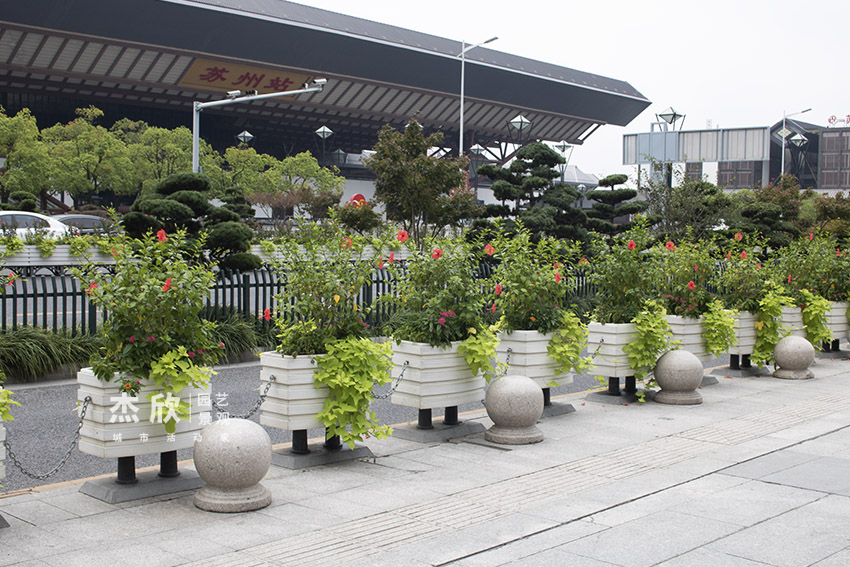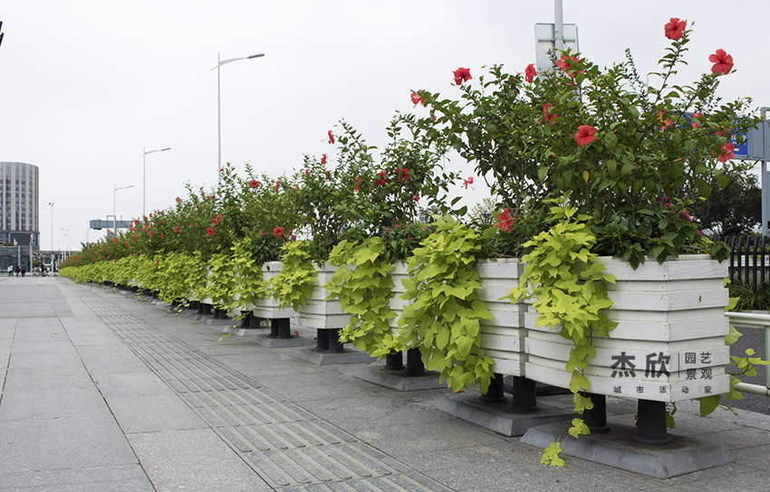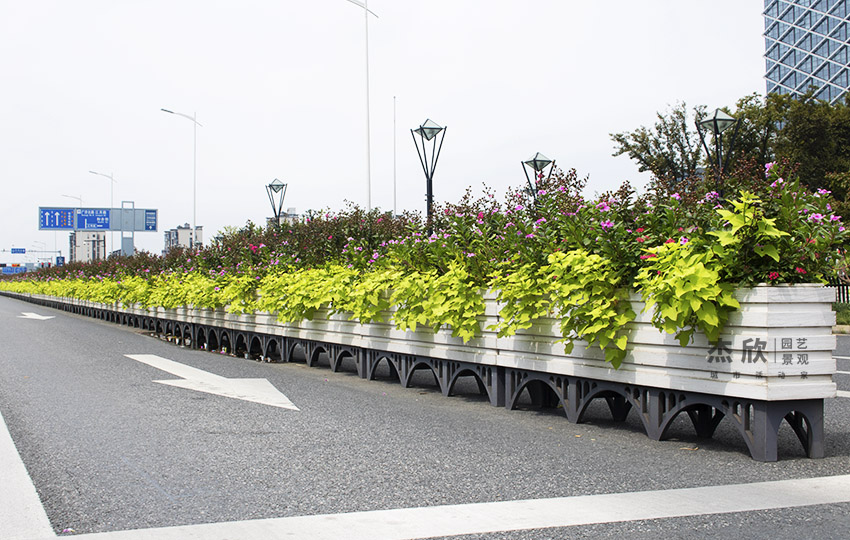 PVC一桶一链花箱造型简约时尚,给道路风景带来一丝柔美。