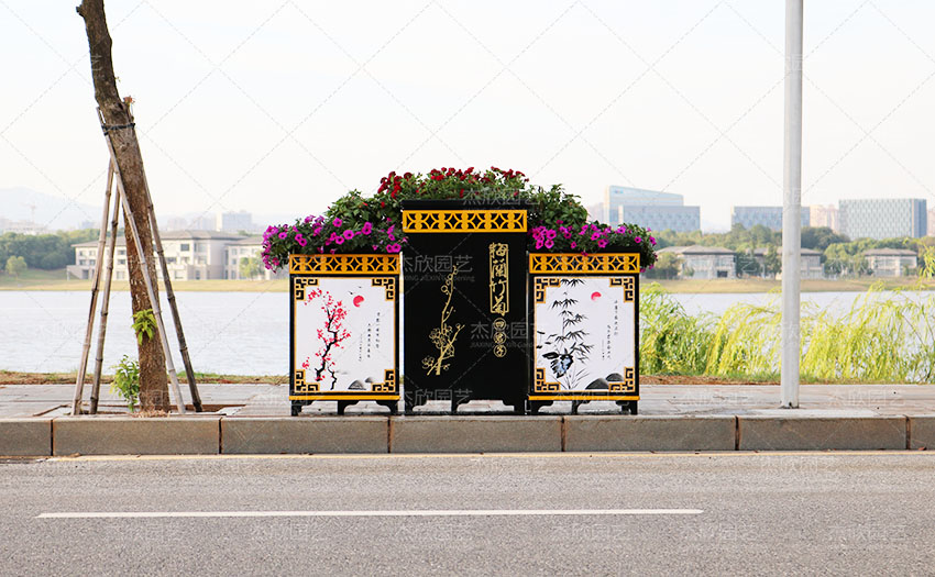组合型花箱在不同的场景中有不同的款式选择?可以选择简洁款,适合自然生态的场景;也可以选择贴花款,偏重文化宣传和时政宣传。