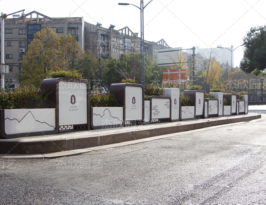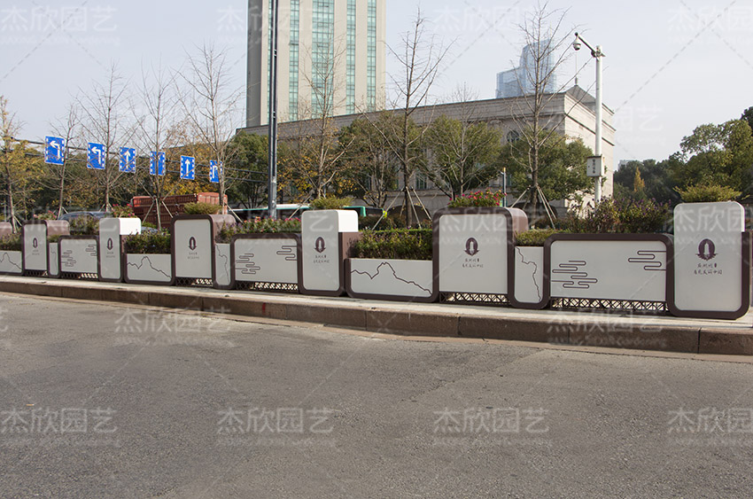 道路隔离带花箱的设计也可以根据客户需求定制,这是一款以山水文人景观为主题的花箱,表现出优美的城市生态风光。