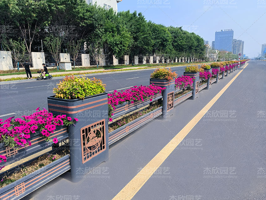在实际中,道路花箱护栏满足了以下的需求:1.尺寸根据场地设计、灵活运用。2.在立面上,展示城市风情与特点。3.在款式上,造型多样,选择范围广。