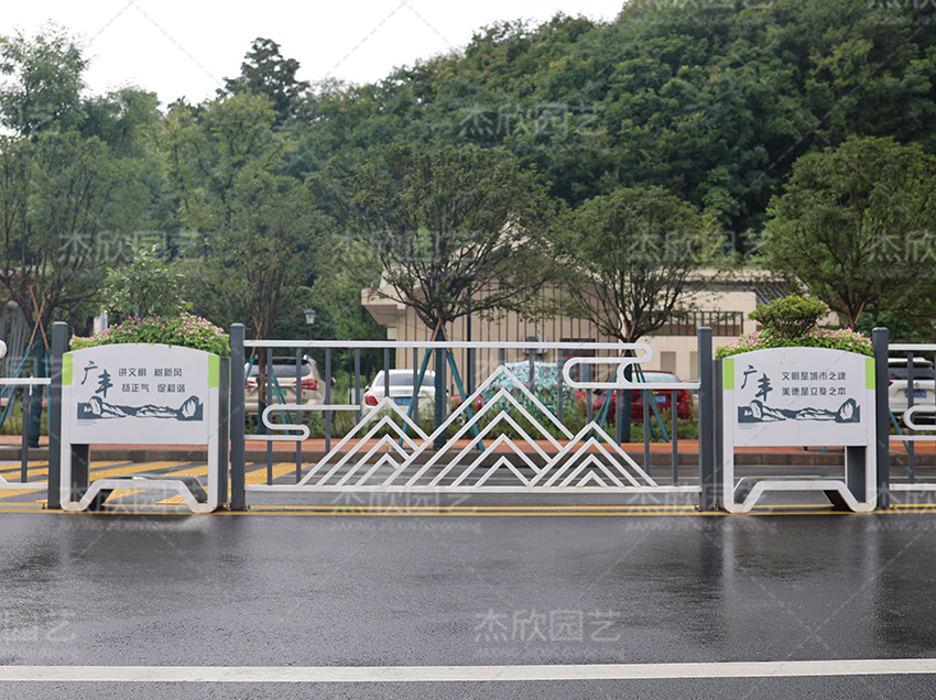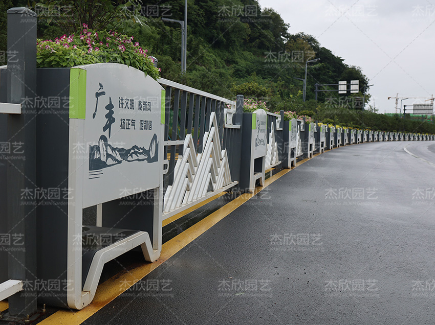 景观护栏以山水为主元素,简洁诗意、如临画境,轻盈的山水白云间,呈现出自然生态的飘逸感。花箱上字体与图画,让人一秒走进了广丰的天地。