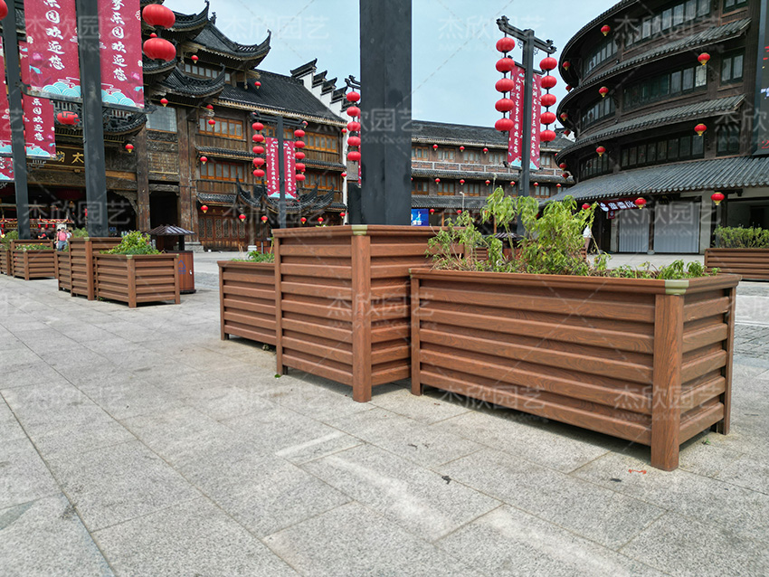 铝合金花箱不仅适用于街道、商场,还适用于古镇景点,尤其是黄檀木色花箱,与古镇的风景更为贴合。