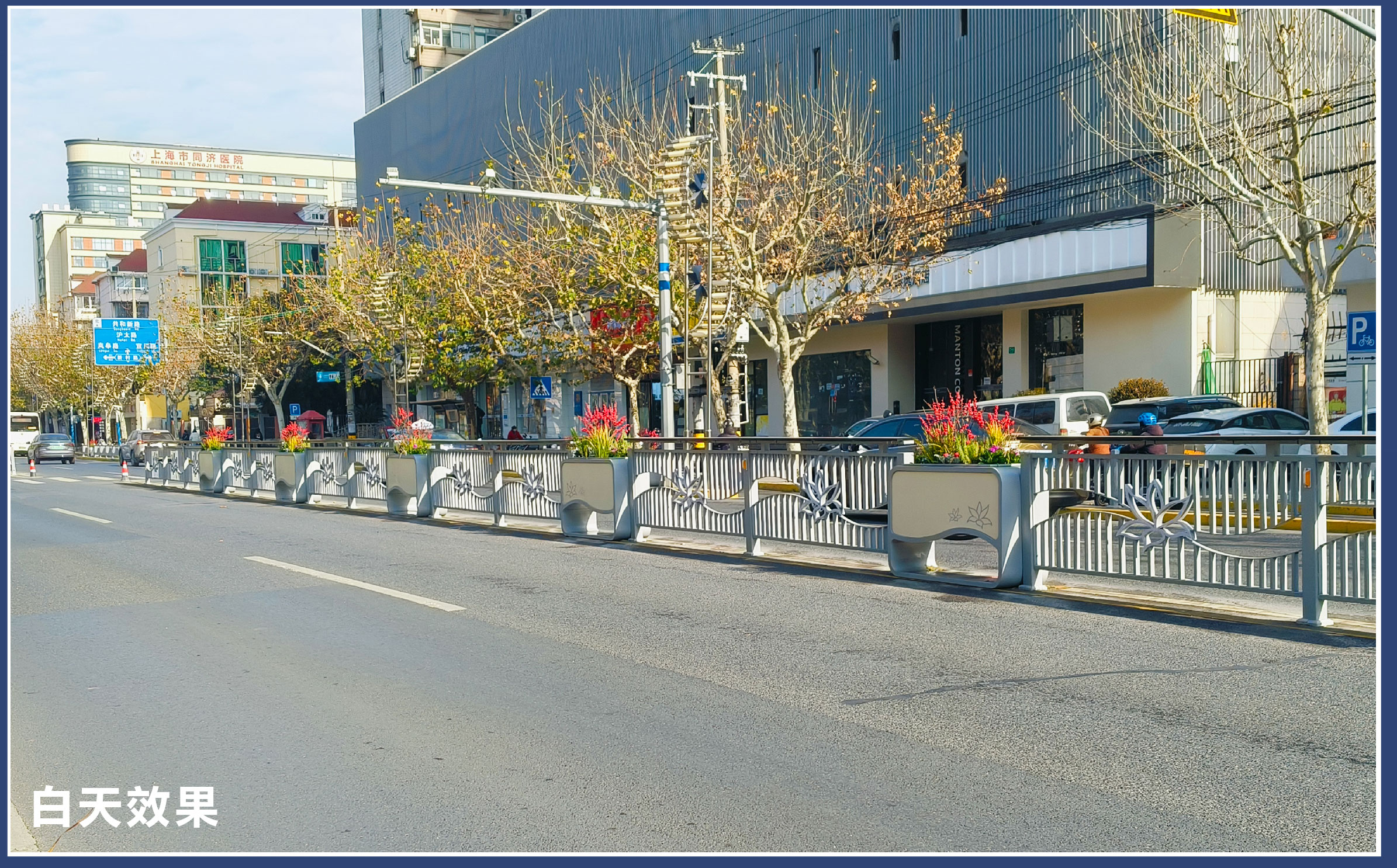 杰欣集团的花箱护栏布置为上海晋陀区带来了生机与活力。花箱中的花卉植物不仅可以美化城市环境,还能净化空气、调节气候。在整体色彩协调方面花箱护栏的颜色和花卉的搭配与城市的整体色调相呼应,同时傍晚护栏中的灯光照明效果,使上海更加温馨、舒适、时尚。在空间功能性上,花箱护栏可以作为城市道路的中央隔离带,划分来往车辆的功能区域,增加城市的交通互动空间。