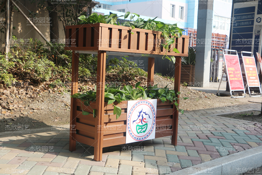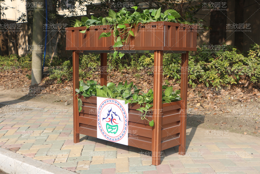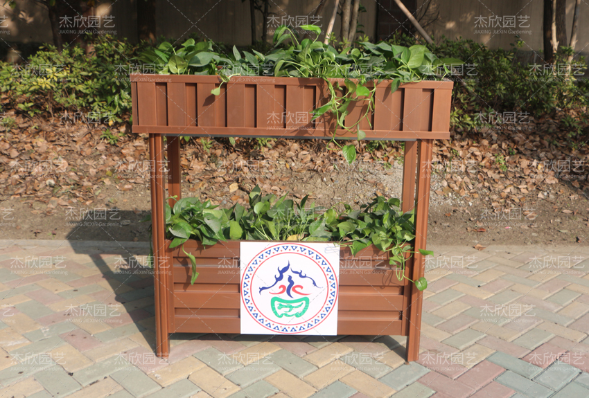户外花箱大多是常规花箱,这款花箱在造型上比较别致,上下两层都可以栽种花卉。花箱的外观与常规木纹花箱不同,是仿铜拉丝花箱。就光泽感、观感,仿铜拉丝花箱质感看起来更好。比较适合古色古香的场景,景区、古街。