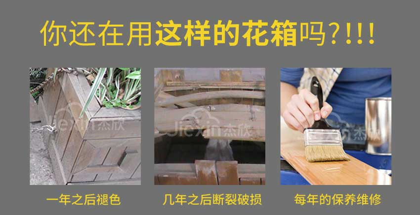 防腐木花箱使用寿命1—3年,比较短,室外容易腐烂发霉变质,防撞性差,已经渐渐被市场淘汰;