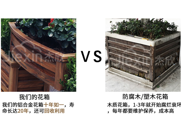 铝合金花箱使用寿命在20年以上,颜色多样,木纹铝合金花箱采用德国进口木纹热转印技术,木纹逼真,不褪色,强度高,铝合金花箱防撞性强;