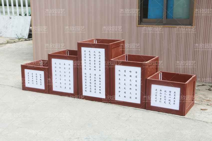 花箱不是千篇一律的。这款花箱就将古诗文融入其中,白色底上飘逸的诗文,红色外框衬托出古韵。这款花箱特别适合学校、公园、文化馆的户外场地上,不仅绿化,也美化!