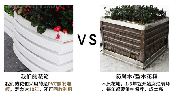 PVC花箱和防腐木花箱不同之处:Pvc花箱由pvc微发泡板加工而成,pvc微发泡板,由化学材料合成而成,防腐木花箱是木质花箱,下边从材质特性来分析两者的不同: