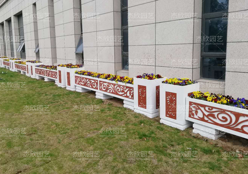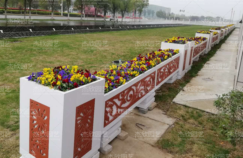 pvc花箱的柔韧性佳,加工性能强,能根据需要定制图案。PVC花箱外部雕刻细腻,色泽一致,图案美观。适合道路美化工程。