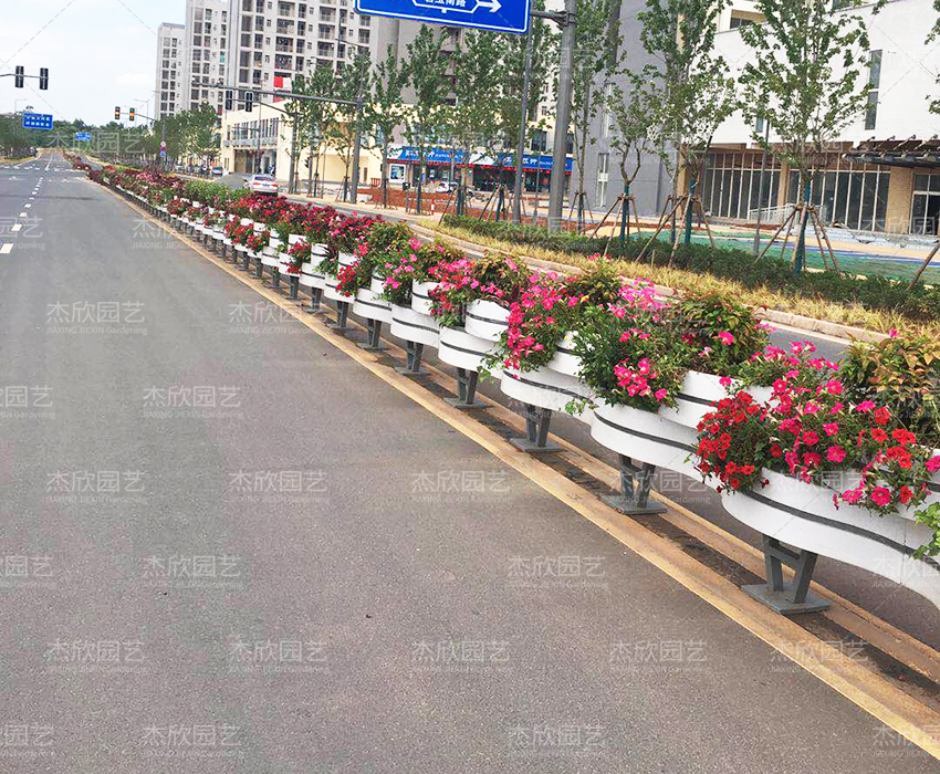 道路花箱一般使用的路程长,花箱的效果、质量都需要考察。道路使用的花箱,款式众多,其中景观效果比较好的是飘带花箱。我们也做了很多飘带花箱的案例,客户的反馈都比较好。