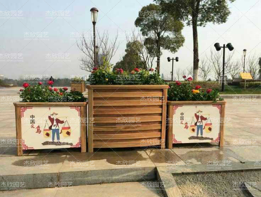 广场花箱摆放更简单,城市广场主要使用黄檀木色,比较清新自然,带来舒适感。这组高低组合广场花箱,还有定制的城市文化,也别有趣味。