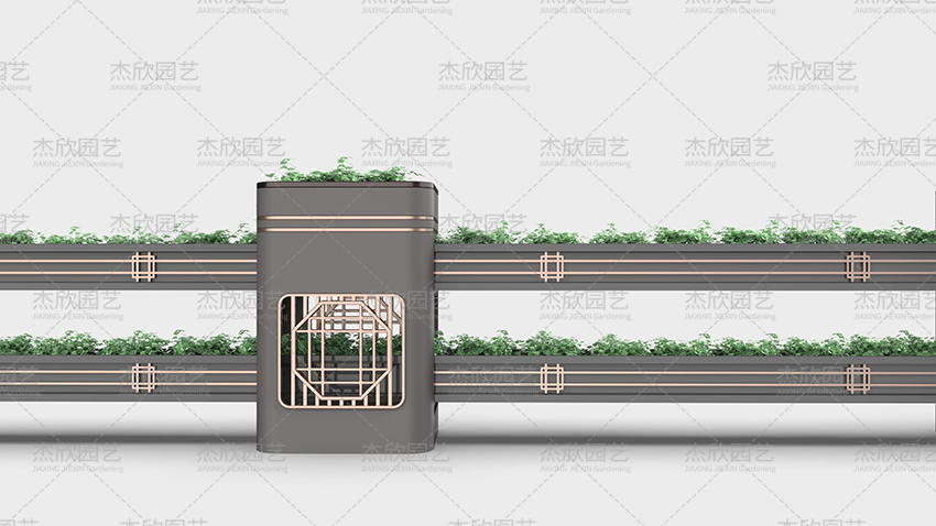 灰色外观带来现代感,香槟色装饰平衡了冷色,更带来一种华丽雅典的气质。这组花箱名叫园林印象,从中国建筑美的精华——园林出发,用现代手法、现代材料,表现出国人喜爱的吉祥美好的生活寓意。