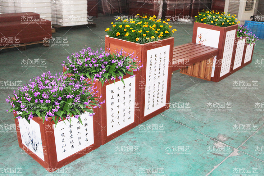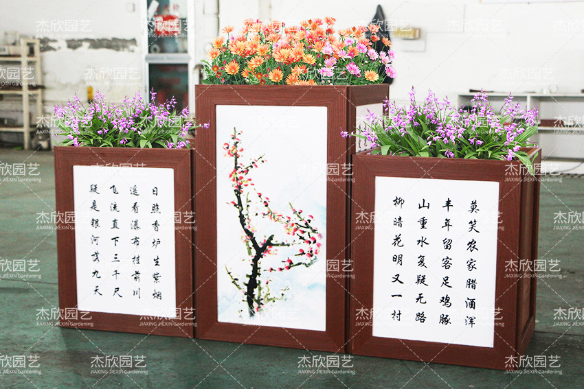 这款花箱的诗文可以定制,满足不同场景的使用。花箱上的图画,不管腊月梅花、春日桃花、盛夏荷花、九月秋菊都可以选择。花箱材料PVC材质,很耐用,箱体清洗便利,维护简单。