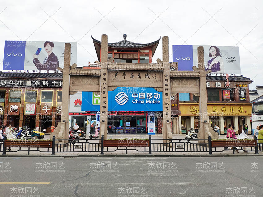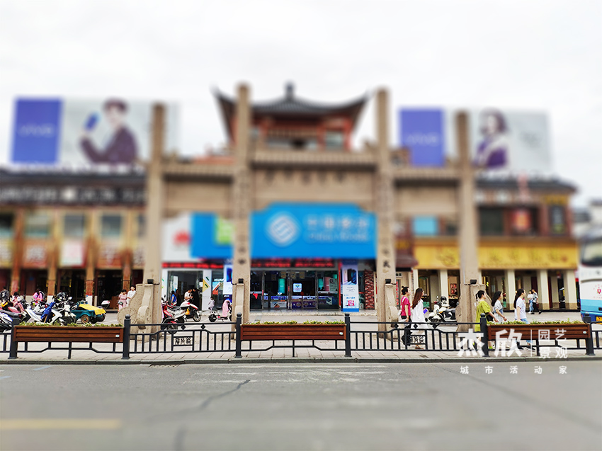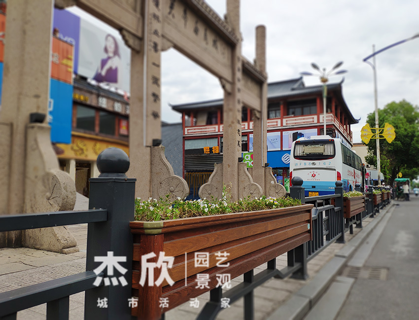 花箱护栏不仅起隔离绿化作用,更与步行街融为一体,增添美感。
