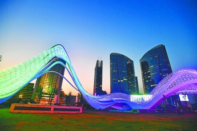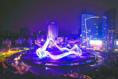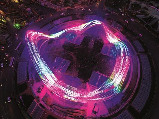 位于武汉光谷广场的雕塑“星河”呈现7种不同颜色,将人们带进梦幻的童话世界、浩瀚的宇宙空间。