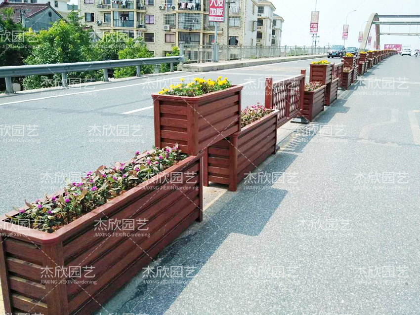 一般桥梁路面两侧的宽度窄,花箱的规格偏小,花箱样式简单。桥梁道路中央隔离带宽度较大,花箱的规格偏大,花箱样式丰富。